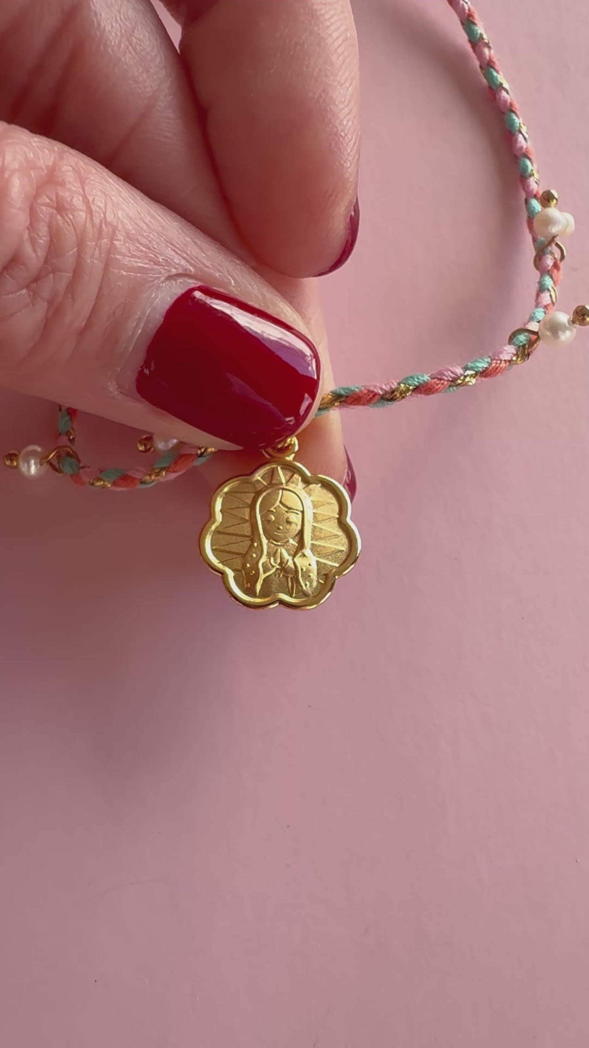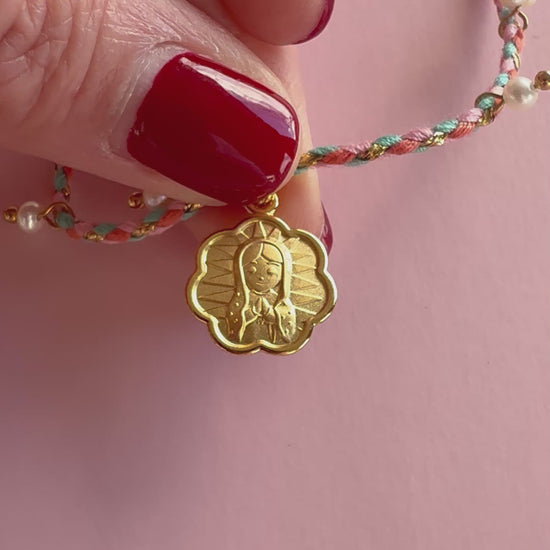 This beautiful necklace features a dainty Our Lady Of Guadalupe medal framed in an elegant flower shaped design, gracefully hanging from a soft satin ribbon.