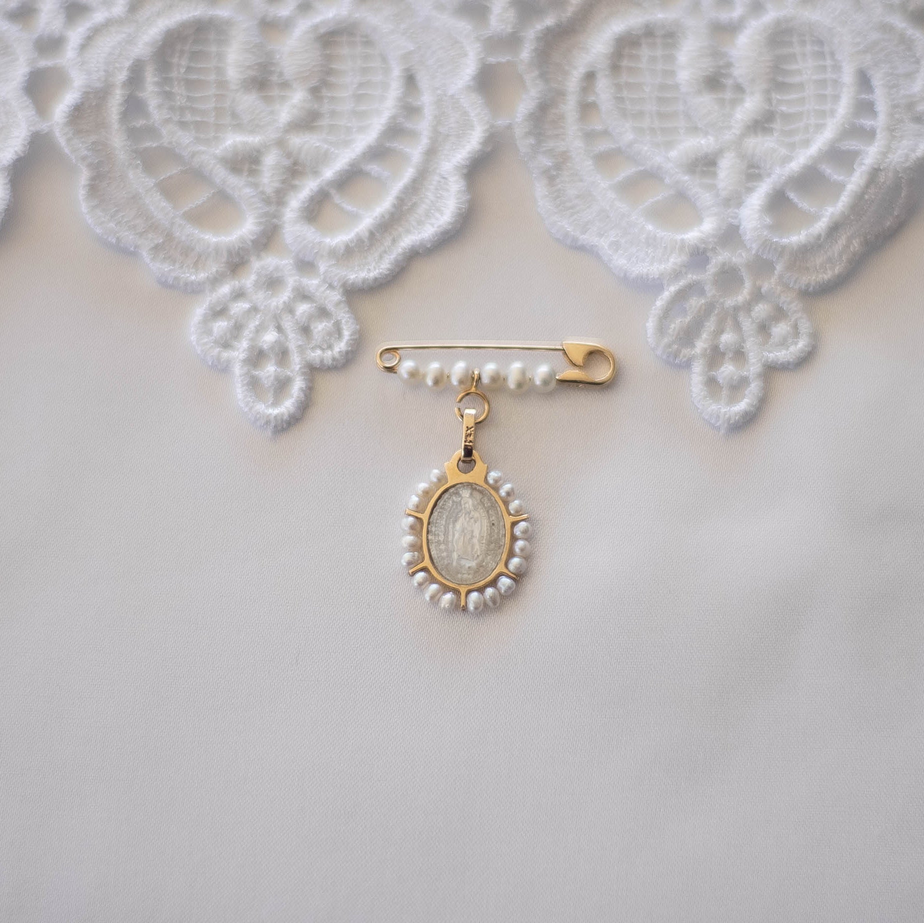 This elegant set features exquisite 14K gold pearl pins, beautifully paired with a stunning Mother of Pearl Our Lady of Guadalupe medal. A timeless and meaningful gift, perfect for baptisms, baby showers, or as a cherished keepsake honoring faith and tradition.