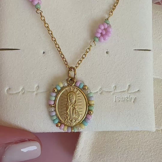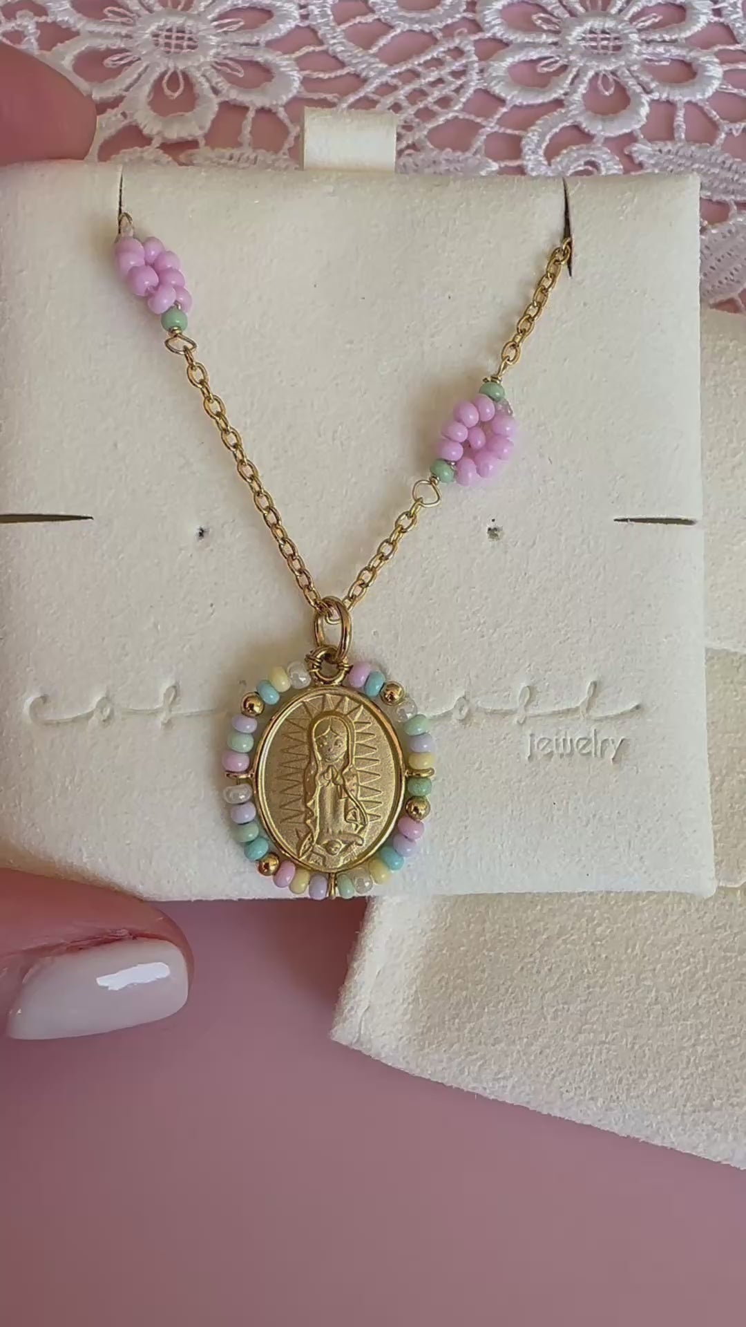 A delicate and meaningful piece, this gold-plated necklace features a beautiful Our Lady of Guadalupe medal surrounded by soft pink flowers. A charming and faith-inspired accessory, perfect for young girls or as a thoughtful gift for a baptism, first communion, or any special occasion