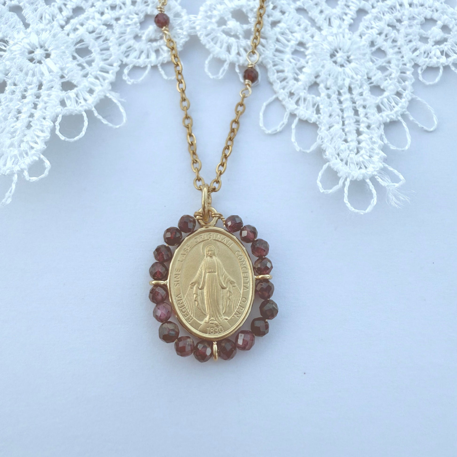 Gold plated Our Lady of Guadalupe necklace adorned with delicate purple beads — a timeless symbol of faith, grace, and devotion. The perfect gift for First Communion, Confirmation, or just because.